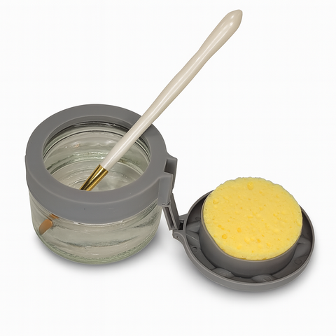 Say goodbye to the frustration of dealing with a dried-out sponge, evaporated water jars with unsightly rings, and the annoyance of dust contaminating your clean water. If you've experienced these issues, you'll be delighted to discover the Diamond Brush Spa by Black Diamond Innovations. This remarkable glass jar, equipped with a patent-pending articulating lid, provides the perfect solution. When not in use, the closed lid effectively prevents evaporation and dust from infiltrating your water. Moreover, the lid's design enables you to conveniently store up to two brushes. When opened, it articulates to the desktop, revealing a perfectly moistened brush-shaping sponge. Compact and efficient, the jar comes with two sponges—one yellow and one blue.